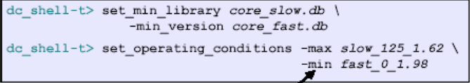 用 set_min_library 设定作保持时间检查的库,第二句话则分别对应了两种时间检查需要用到 的工作条件。