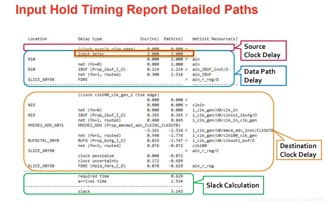 约束能够让软件优化布线布局,同时时序分析报告把时序路径分为三部分,然后分别计算各部分的延时,最后计算出裕量slack,根据slack的值来判断时序是否正确。